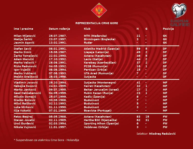 Odbrana: Stefan Savić (Atletiko Madrid, Španija), Marko Simić (Liepaja, Letonija), Žarko Tomašević (Astana, Kazahstan), Adam Marušić (Lacio, Italija), Marko Vešović (Karabag, Azerbejdžan), Risto Radunović (FCSB, Rumunija), Igor Vujačić (Partizan, Srbija), Marko Vukčević (UTA Arad, Rumunija), Meldin Drešković (Sutjeska);